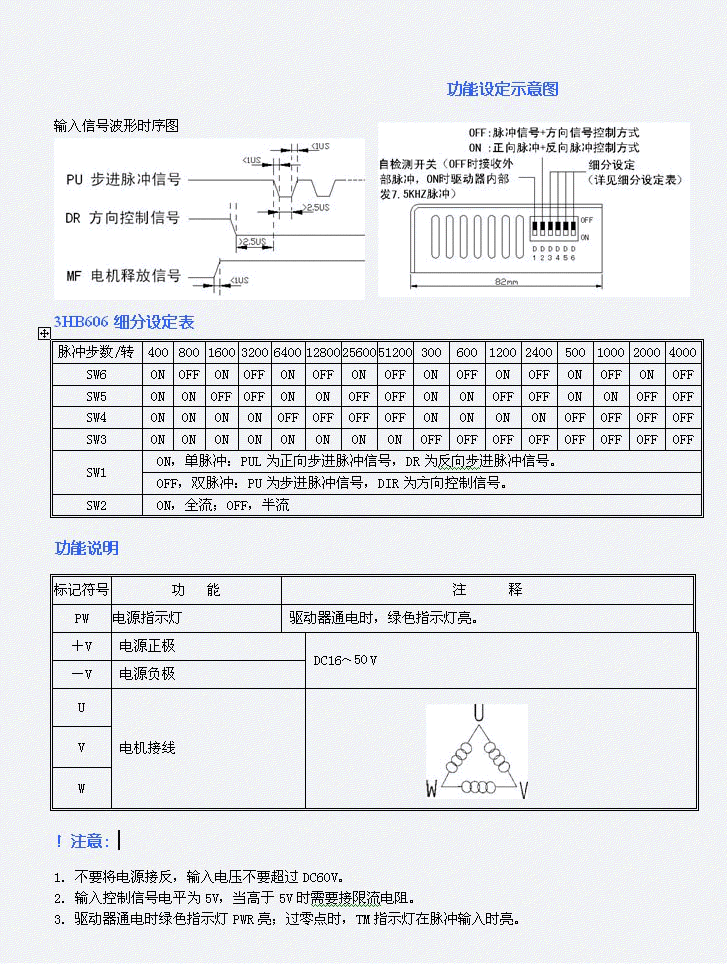 設(shè)有16檔等角度橫力矩細分 單/雙脈沖輸入兼容 步進脈沖停止超過1s時線圈電流減半,減小了許多場合的電機過熱