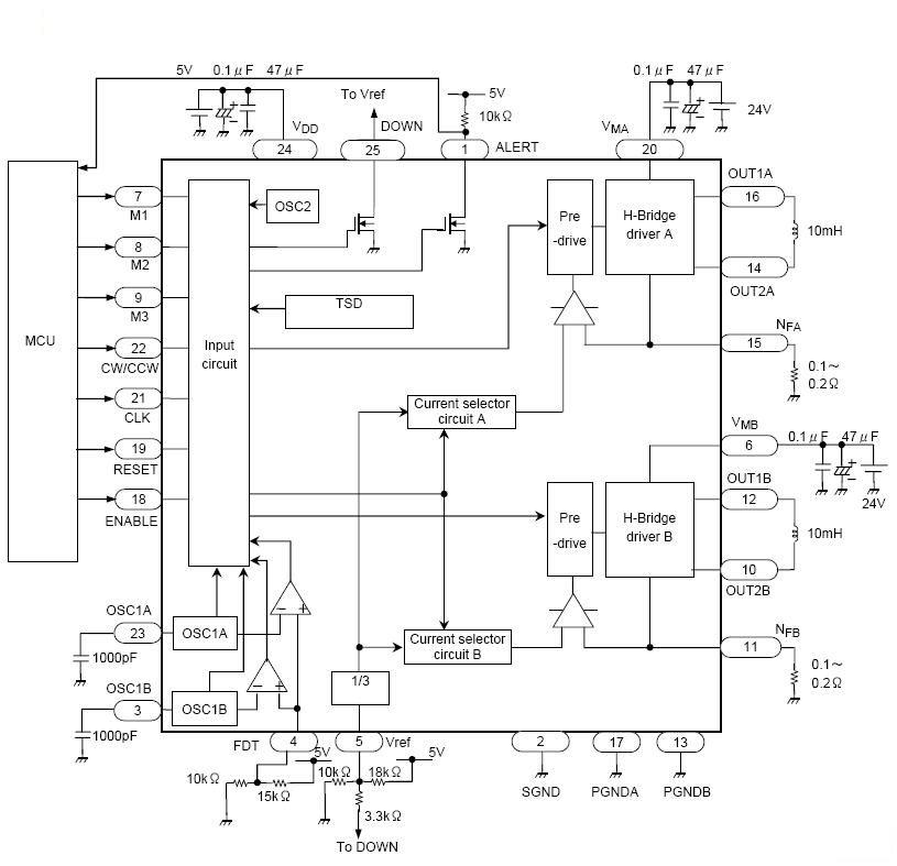1、單芯片兩相正弦細(xì)分步進(jìn)電機(jī)驅(qū)動(dòng) 2、直接采用單脈沖和方向信號(hào)譯碼控制模式 3、采用高耐壓BiCD工藝,Ron=0.4Ω 4、可實(shí)現(xiàn)正反轉(zhuǎn)控制 5、通過4位選擇8檔細(xì)分控制(1/2,1/8,1/10, 1/16, 1/20, 1/32, 1/40, 1/64 ) 6、高輸出耐壓(VDss=50 V ) 7、高輸出電流(Iout=4.5 A) 8、HZIP25-P-1.27封裝(形狀和管腳的尺寸和TA8435、TB6560HQ、THB6016H一樣) 9、有輸出監(jiān)視管腳(DOWN / ALERT)。 10、有復(fù)位和使能管腳 11、芯片內(nèi)部有過熱保護(hù)(TSD)和過流檢測電路